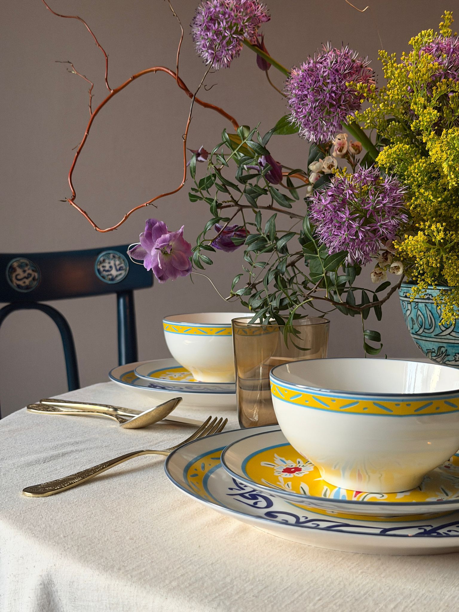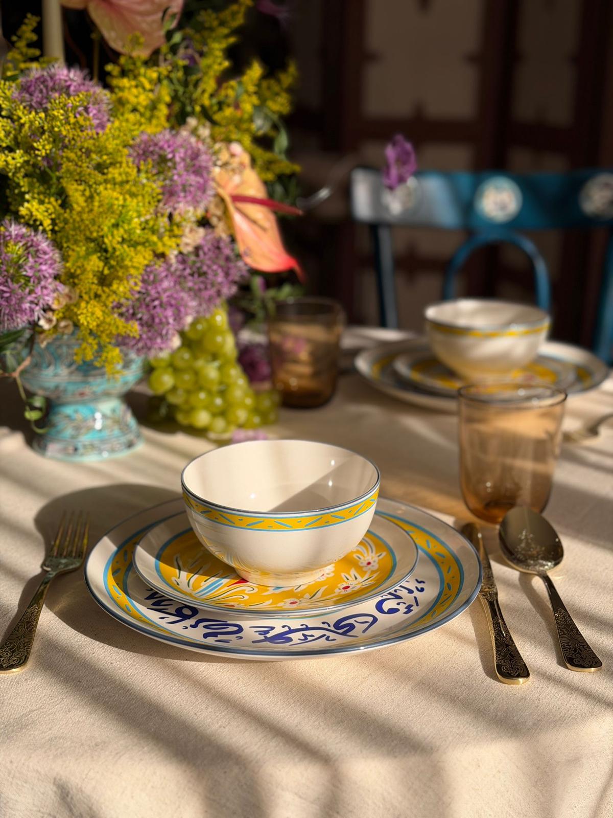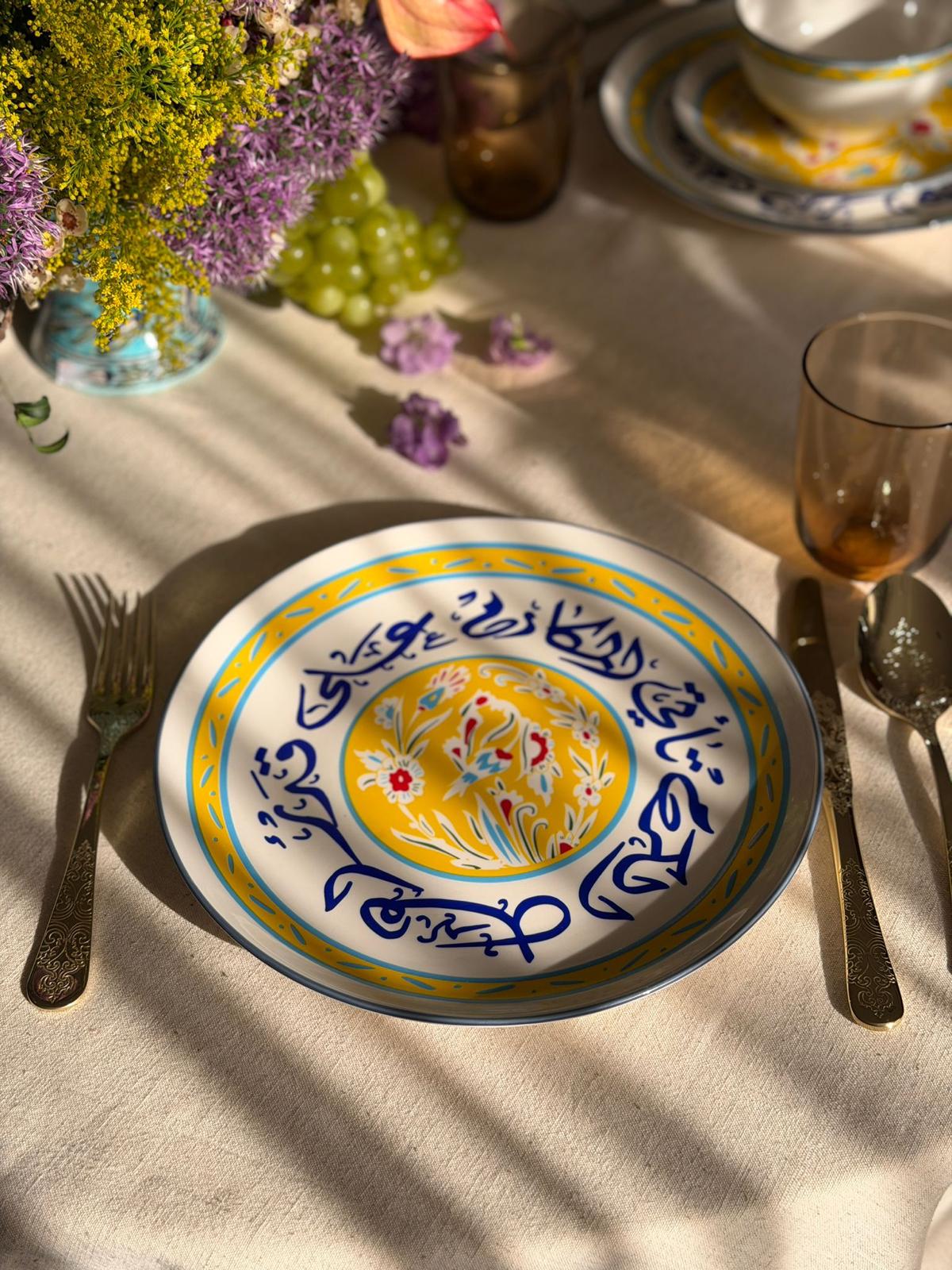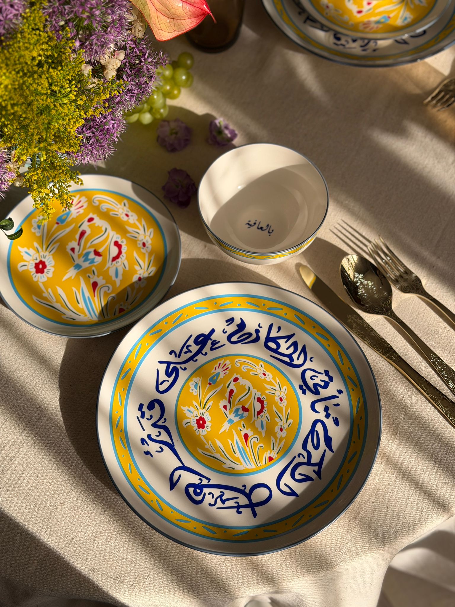 لهواة اللون الاصفر .. نقدم هالسنة طقم مائدة لأربعة أشخاص، مؤلّف من ثلاث قطع مزينة بالنقوش القيشانية التراثية، تتوّجها العبارة: