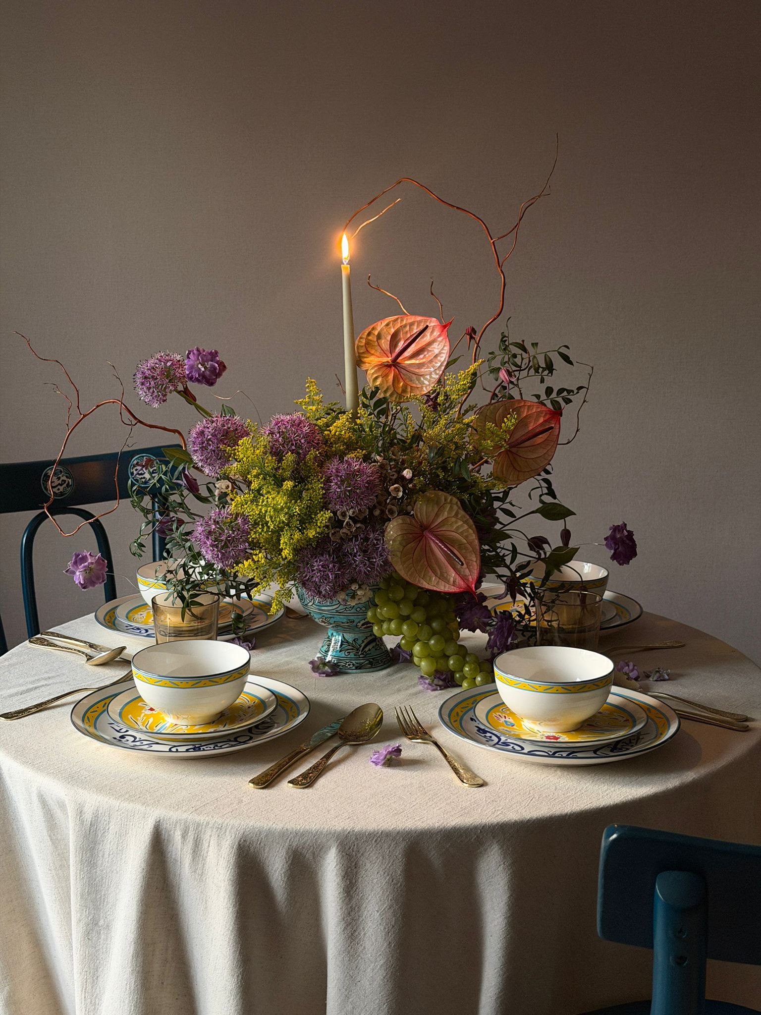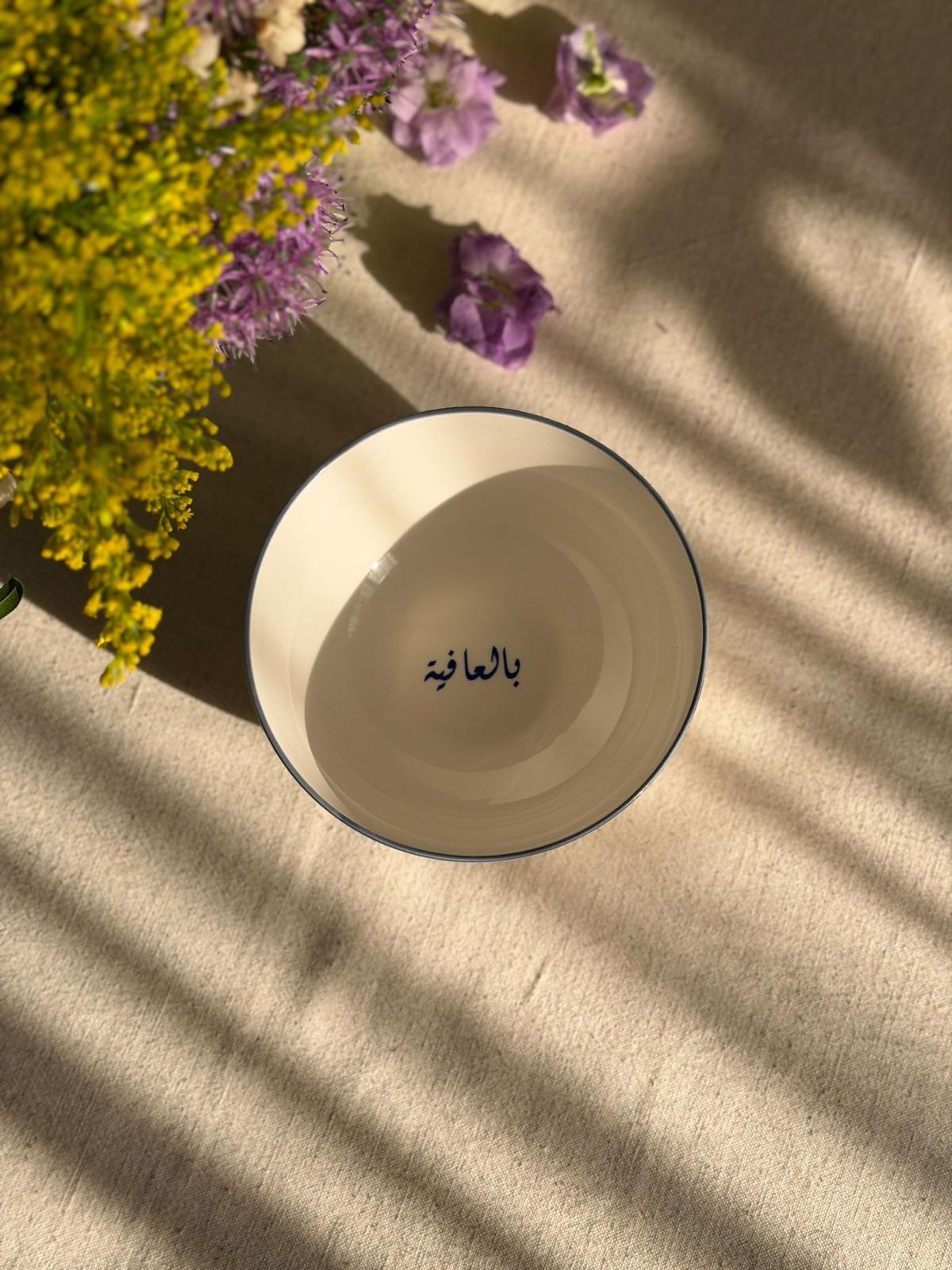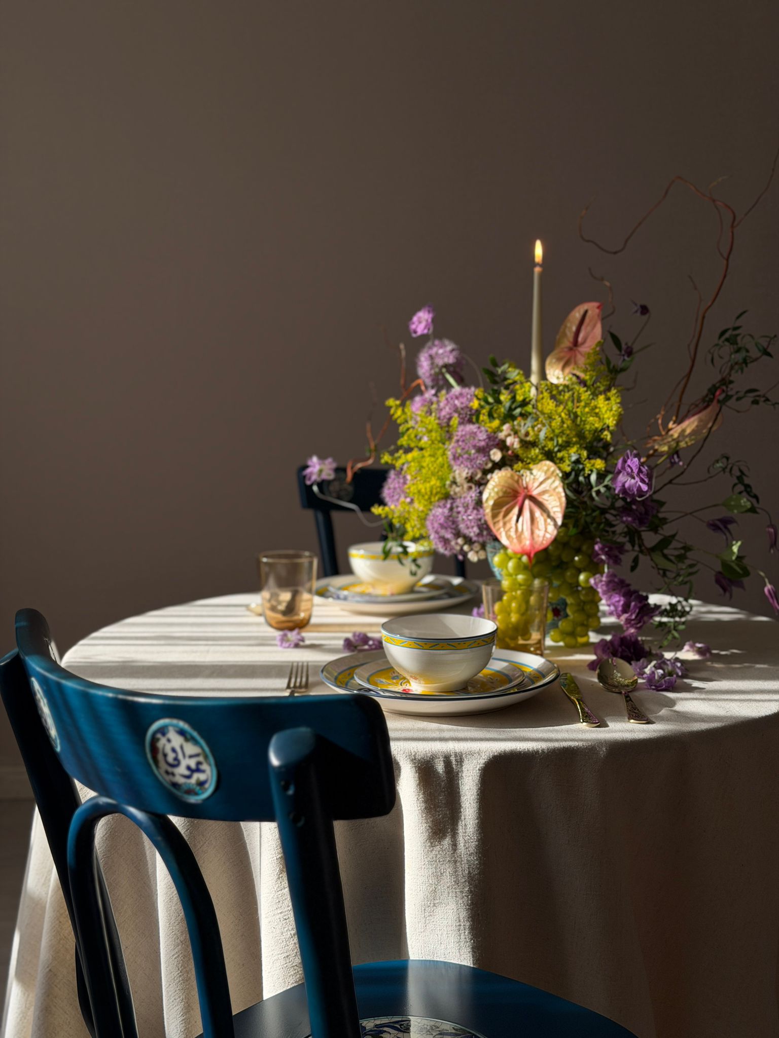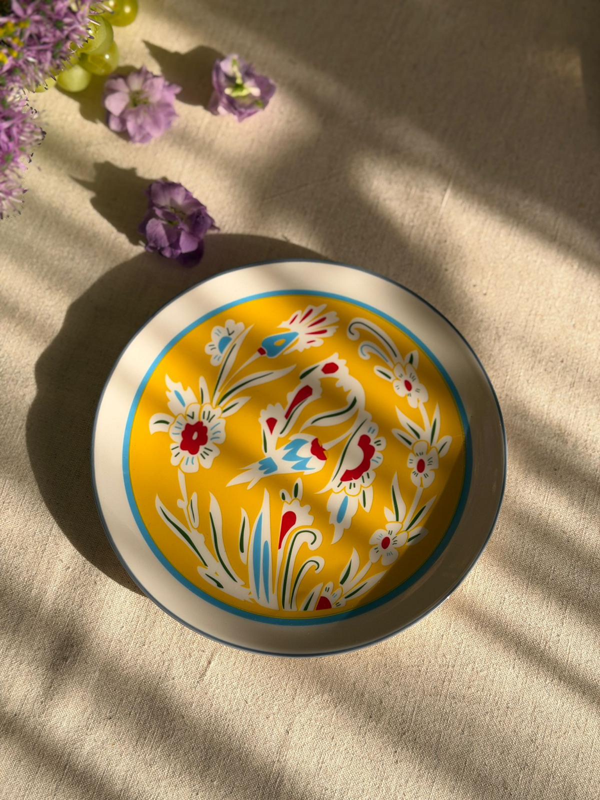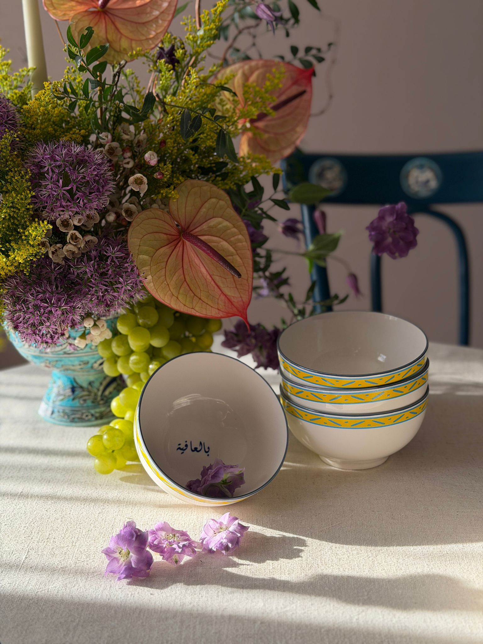 لهواة اللون الاصفر .. نقدم هالسنة طقم مائدة لأربعة أشخاص، مؤلّف من ثلاث قطع مزينة بالنقوش القيشانية التراثية، تتوّجها العبارة: